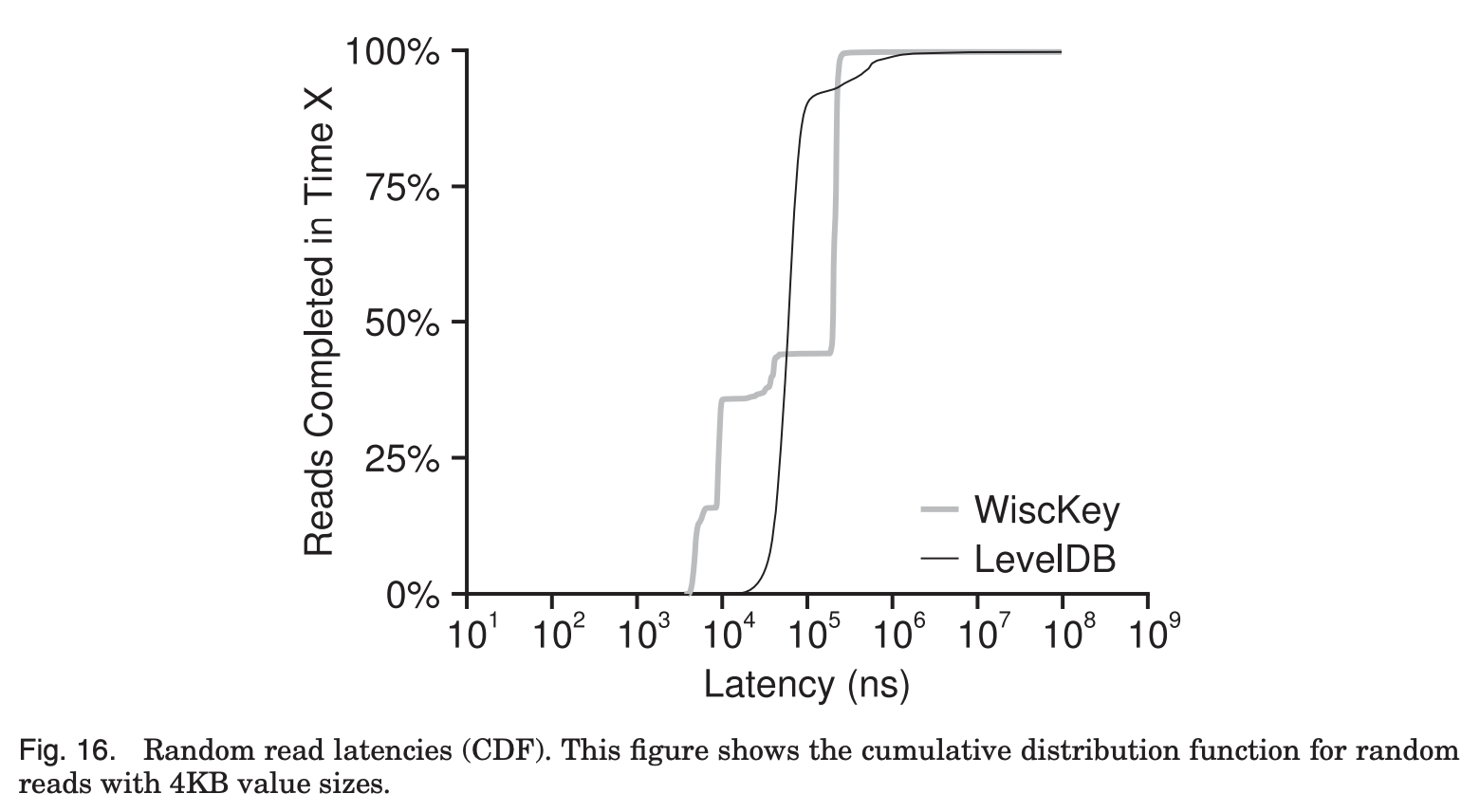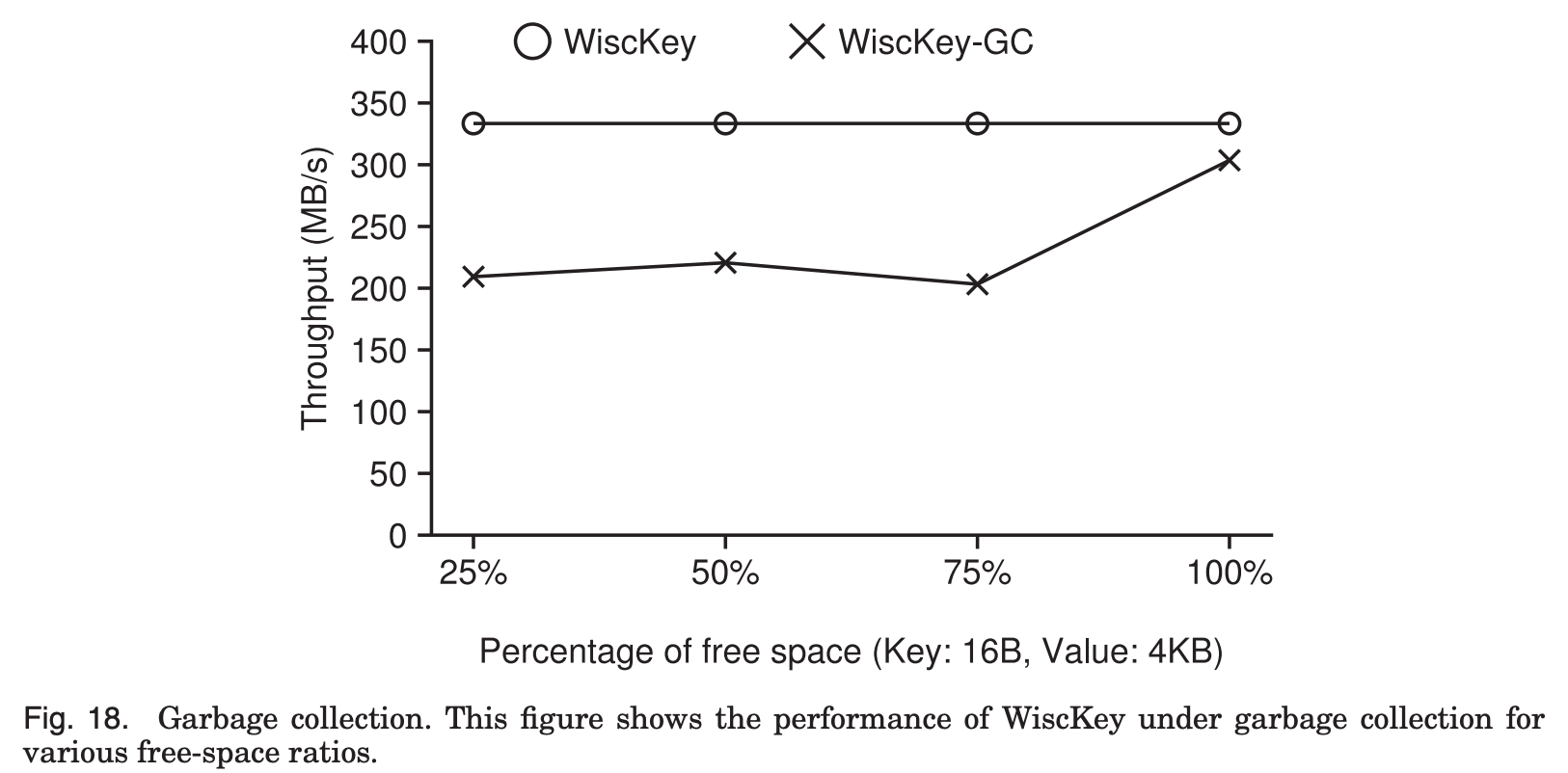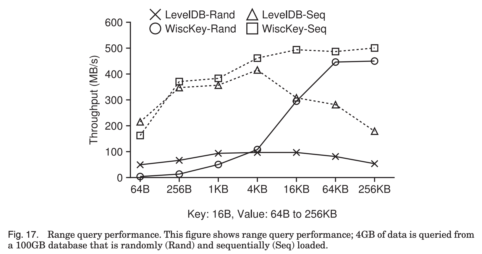 WiscKey의 경우 value size가 4KB를 넘어가면서 장치의 최대 성능을 보임을 알 수 있다.
