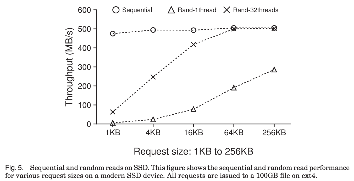 위에서 보여준 Fig.5에서 알 수 있듯이, SSD에서는 64KB 이상의 큰 size로 random read를 하면, throughput이 sequential read와 같은 수준까지 올라오기 때문에,