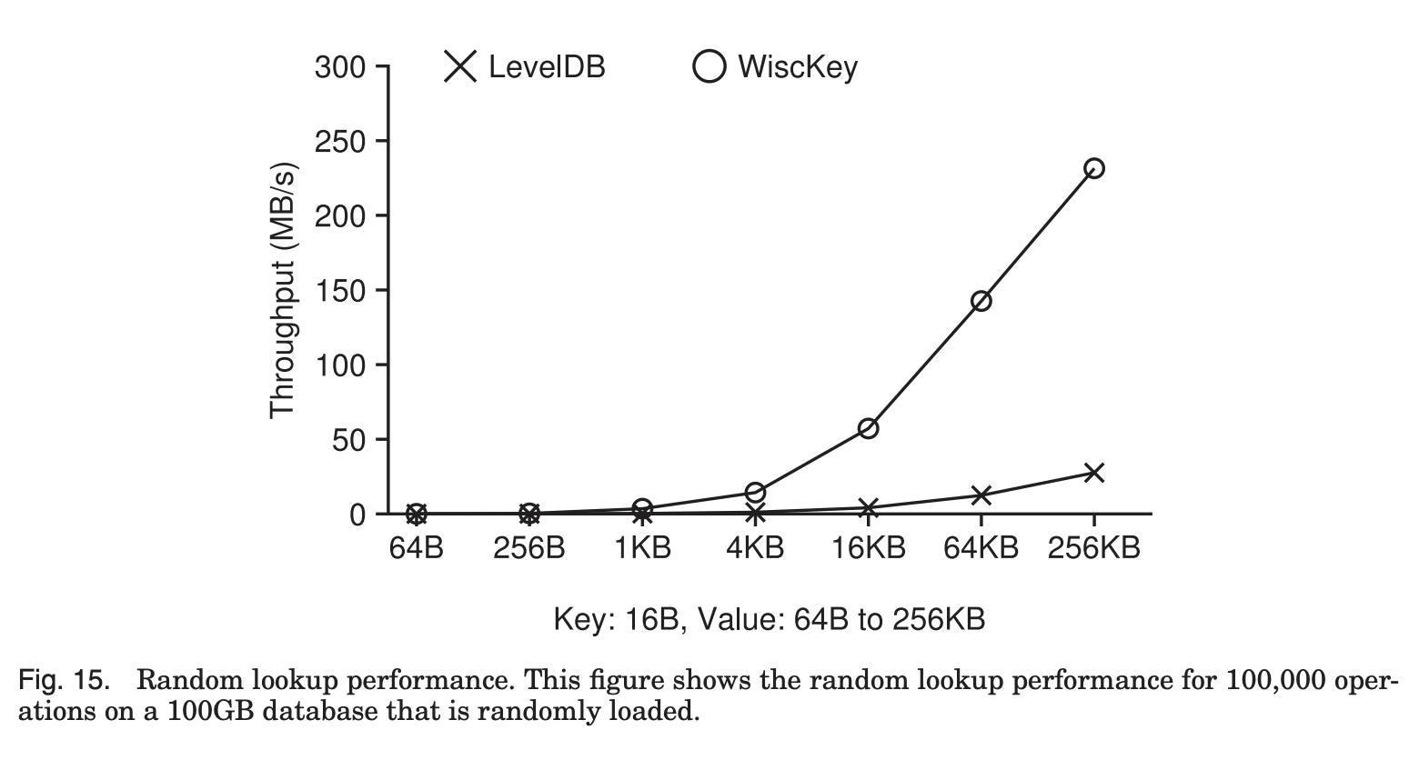 따라서 64B같이 작은 크기의 data의 경우 SSD의 제한된 parallel random read throughput으로 인해 WiscKey의 성능이 LevelDB에 비해 12배 떨어진다.