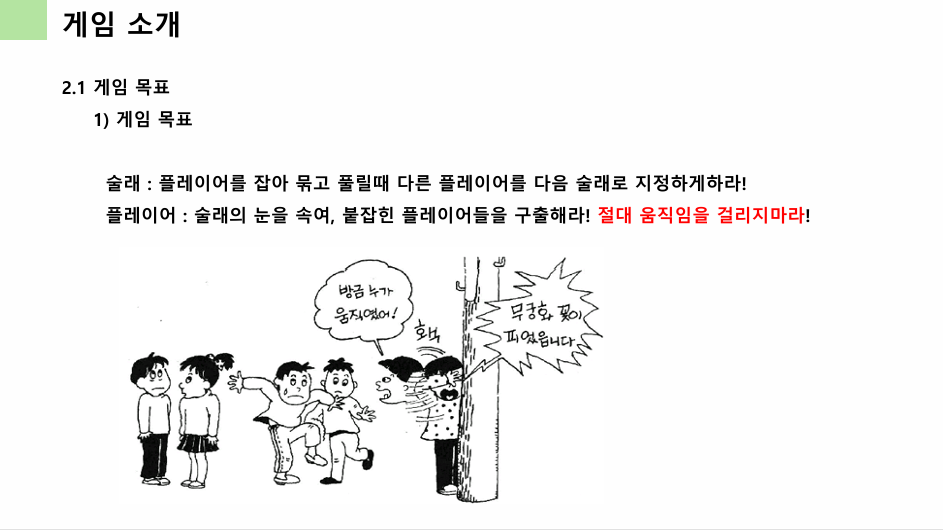 오늘.. 드디어 기획 공부가 시작이 되었다.. 정말 재미가 있던거 같다! 기본적으로 튜터님께서 오늘은 기획이라는것에 발을 담가보는 시간이다 너무 겁먹지말고 우리가 풍덩 빠지는게 좋겠다라고 말씀을하셨다. 무궁화 꽃이 피었습니다 라는 전통 게임을 한 줄로 표현해보기 , 3줄로 설명하기 , 내가 아는대로 기획서로 만들어보기를 했는데 정말 생각보다 어려웠다. 다 알지만 이걸 분석해서 말할려하니깐 말이 바로바로 나오지는 않더라 그래도 내가 좀 내 스타일대로 만들어보았다