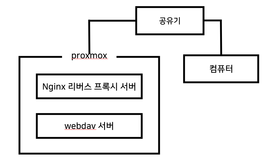 이 글을 따라가면 이런 구조로 구축된다. proxmox 쪽은 리버스 프록시 서버 컨테이너, webdav 서버 컨테이너로 구성되며 그 중 리버스 프록시 서버 컨테이너만 외부로 노출된다.