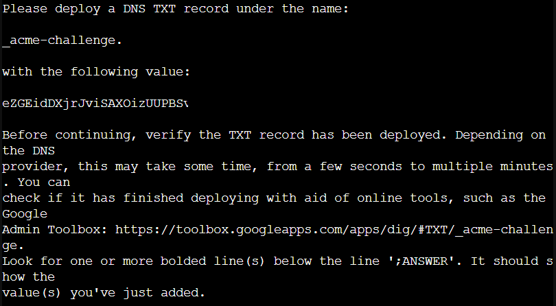$ sudo certbot certonly --manual -d *.your.domain -d your.domain --preferred-challenges dns