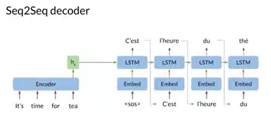 input에서 <sos>가 전달되어 입력 단어가 종료되면 Decoder이 시작된다. 첫 번째 단계에서, Encoder에서 전달된 hidden state와 input <sos> 를 기반으로 output의 첫 번째 단어를 예측한다. 예측한 단어와 Decoder의 첫 번째 단계에서 나온 hidden state를 기반으로 output의 두 번째 단어를 예측한다. decoder은 이러한 과정을 반복하여 output sequence를 예측할 수 있다.