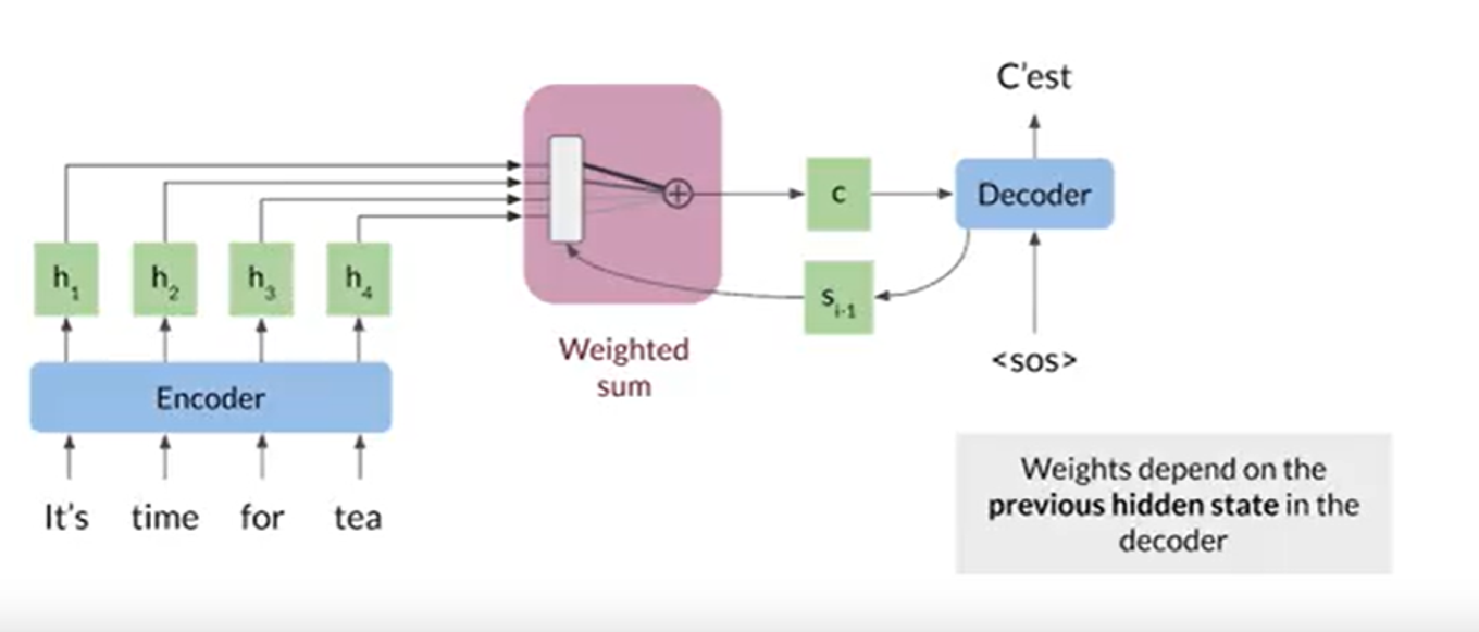그러나, 모든 hidden state를 한 번에 사용하기에는 연산량이 과하게 많았다. 이 때문에, hidden state들을 하나의 hidden state의 크기로 압축하는 방식이 필요했고, 이를 weighted sum으로 해결하였다. 해당 단계에서 중요도가 높은 hidden state에 높은 weight를 주고자 한 것이다. 이 때의 weight를 중요한 것에 집중한다고 하여 Attention이라 명명되었다.