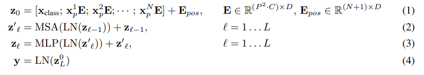 Vision Transformer의 전체 구조를 식으로 표현하면 다음과 같다.