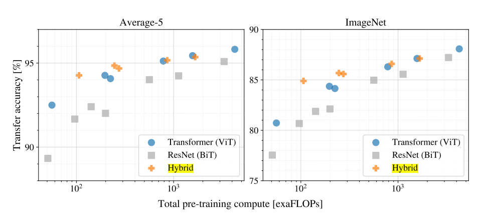 여러 크기의 ViT, ResNet, Hybrid 모델을 실험한 결과.