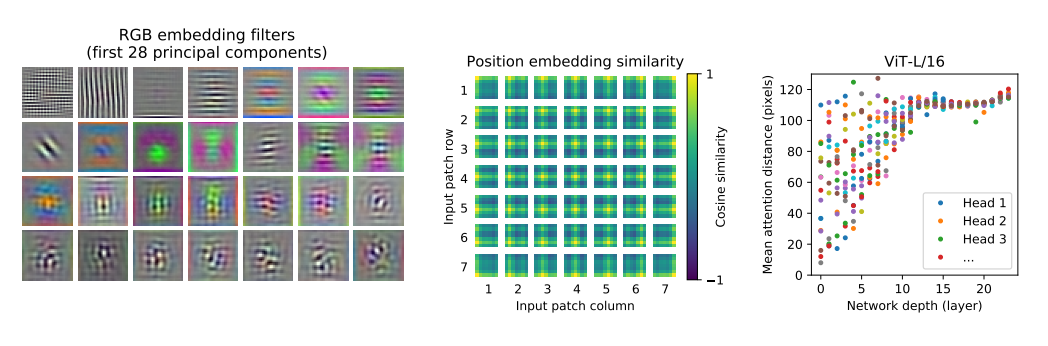 오른쪽 그림은 각 head의 attended distance를 의미한다. self-attention은 CNN과 달리, 낮은 단계에서도 멀리 떨어진 patch에게 영향을 줄 수 있다. 이를 확인하기 위하여 각 층의 attention weight를 이용하여 평균적으로 attend하는 pixel과의 거리, attention distance를 계산하였다. (CNN의 receptive field size 역할). 오른쪽 그림을 보면, 낮은 단계에서는 attention distance가 퍼져 있고, 높은 단계로 갈수록 점차 커지는 것을 알 수 있다. 이는 기본적으로 CNN의 작동 방식과 유사하나, 낮은 단계에서 근처의 영역만 확인하는 것이 아니라 global 한 영역도 확인한다는 차이를 보여준다.