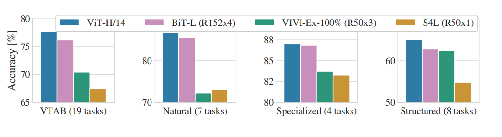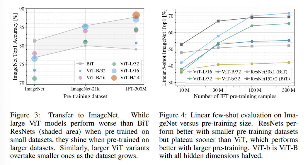 하지만, 대규모 데이터셋(14M-300M images)을 사용할 경우, inductive bias가 충분히 학습되어 CNN 구조의 성능을 이기는 것이 발견되었다.