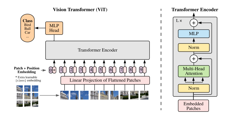 Trnasformer 원본의 encoder은 multihead self-attention의 alternating layer(MSA, Appendix A)와 MLP block으로 구성되어 있다. (eq 2, 3) Layernorm(LN)은 모든 블럭의 앞에 추가되며, residual connection은 모든 블럭의 후에 추가된다.