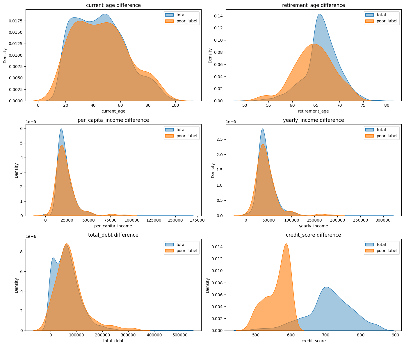 sns.kdeplot(data=poor, x=col, label='poor_label', fill=True, alpha=0.6, ax=axes[i])