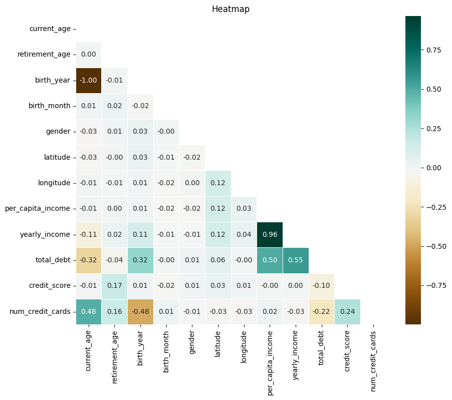 sns.heatmap(corr_matrix,annot=True, cmap='BrBG', linewidths=0.5, mask=mask, fmt=".2f")