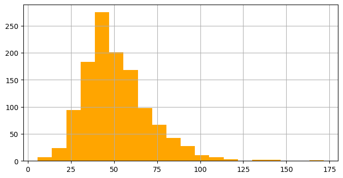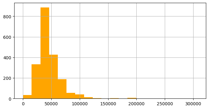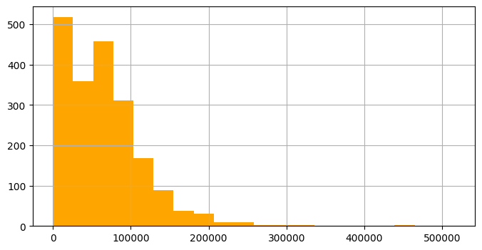 grouped['amount'].hist(bins=20, color='orange', figsize=(8, 4))