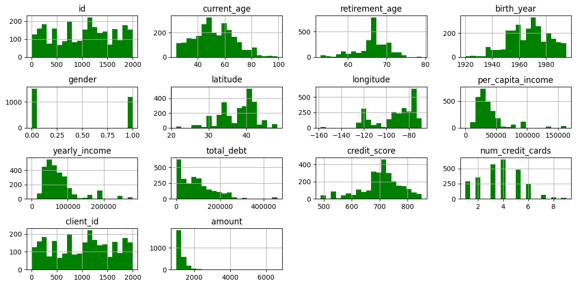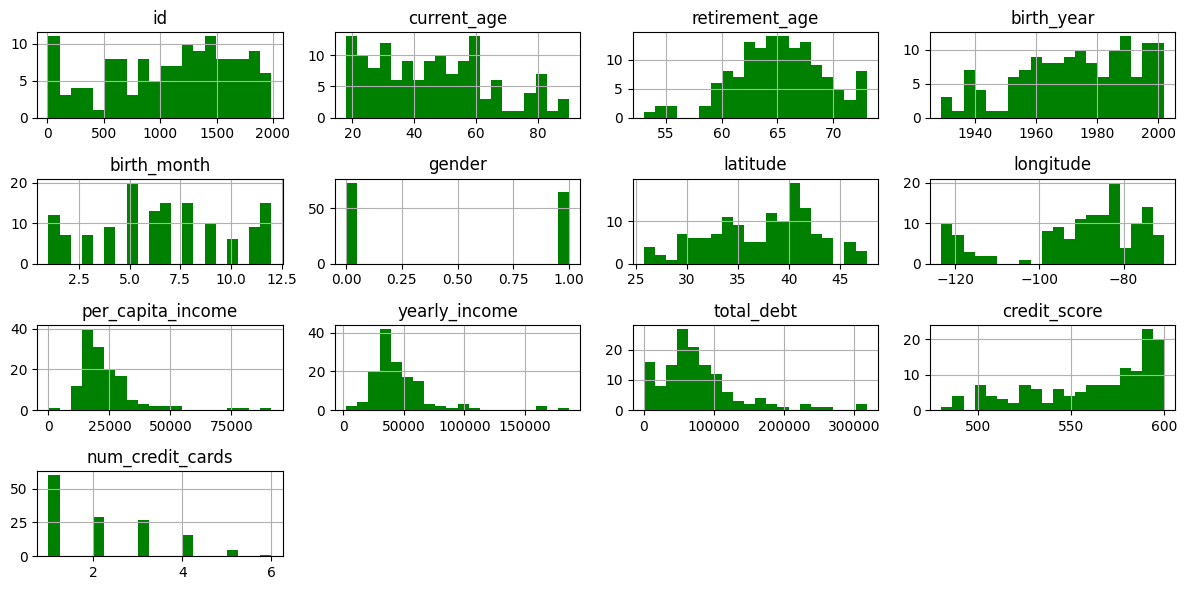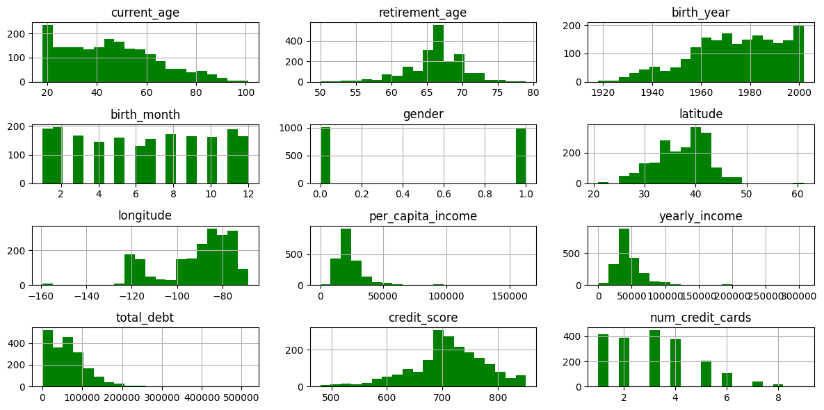 df_high.hist(bins=20, figsize=(12, 6), color='green')