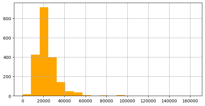 users1['per_capita_income'].hist(bins=20, color='orange', figsize=(8, 4))