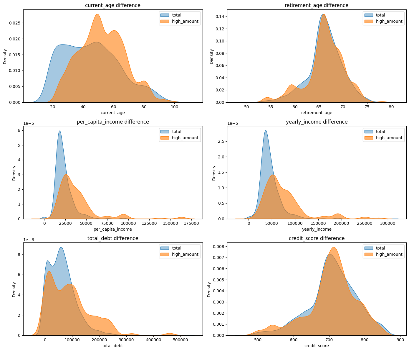 sns.kdeplot(data=df_high, x=col, label='high_amount', fill=True, alpha=0.6, ax=axes[i])