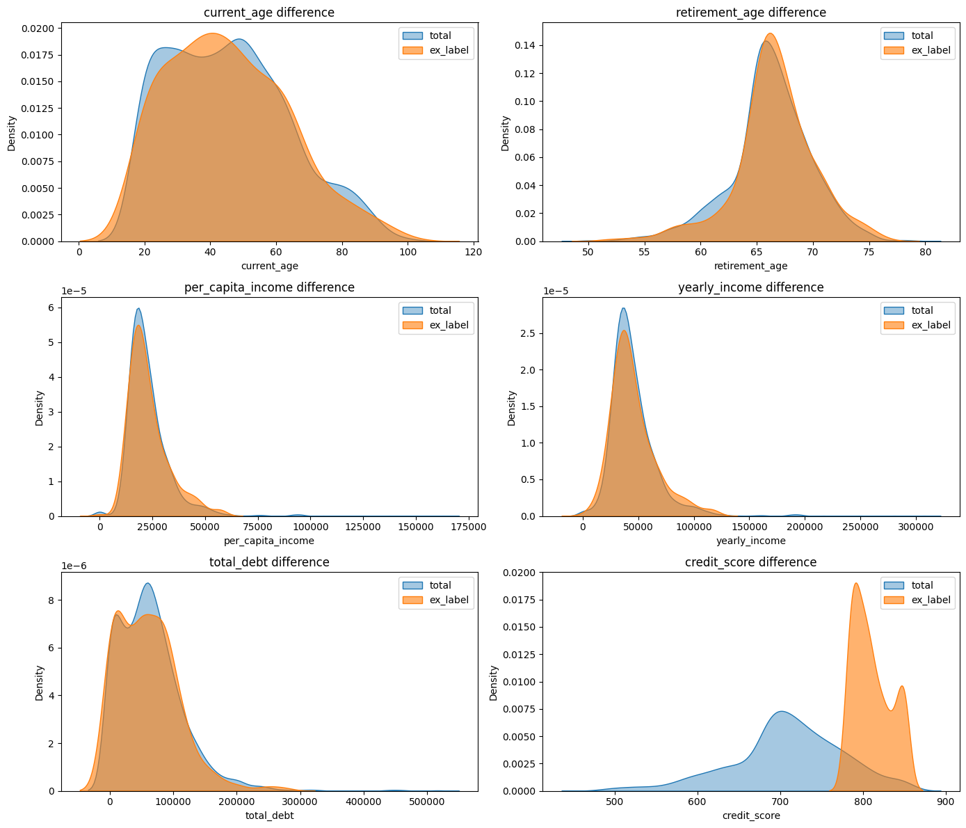 sns.kdeplot(data=ex, x=col, label='ex_label', fill=True, alpha=0.6, ax=axes[i])