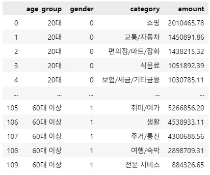 age_group, gender, category])[ amount ].sum()df = merged_clean[['category', 'amount', 'client_id_x', 'current_age', 'gender']]
