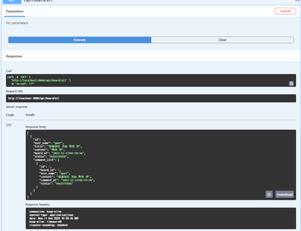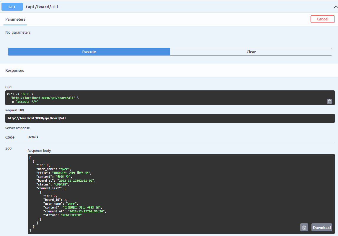 ui 형태로 보다 편리하게 api명세서 형태로 관리 및 테스트 확인을 할 수 있음.