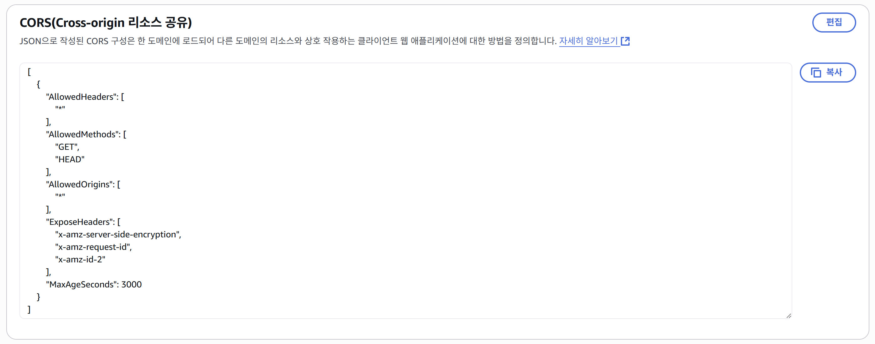 ⑧ CORS 문제 해결이 필요할 경우, 권한 > CORS(Cross-origin 리소스 공유)에 아래의 내용을 입력하면 된다.