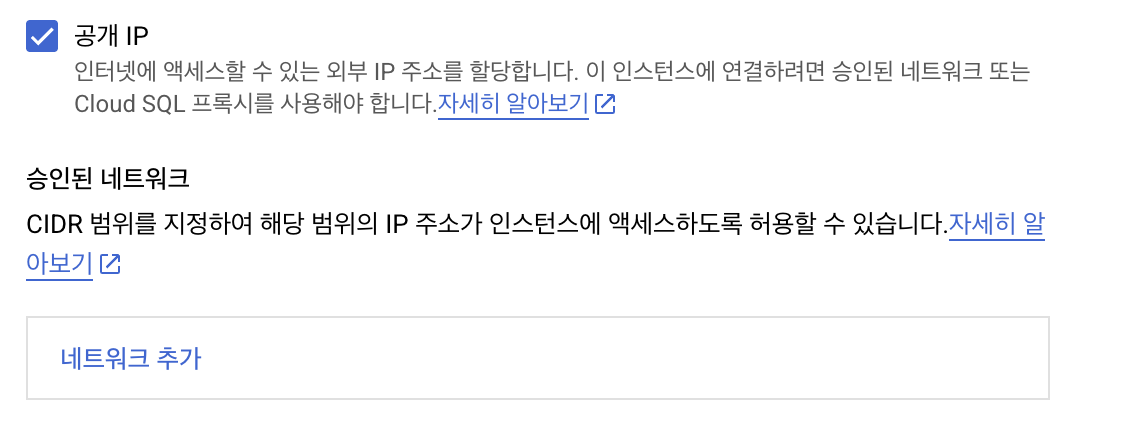 하지만 Public ip를 할당하고, 승인된 네트워크 항목을 비워두게 되면, GCP 내부 API 인 Cloud SQL Auth Proxy만 접근이 가능하게 된다.