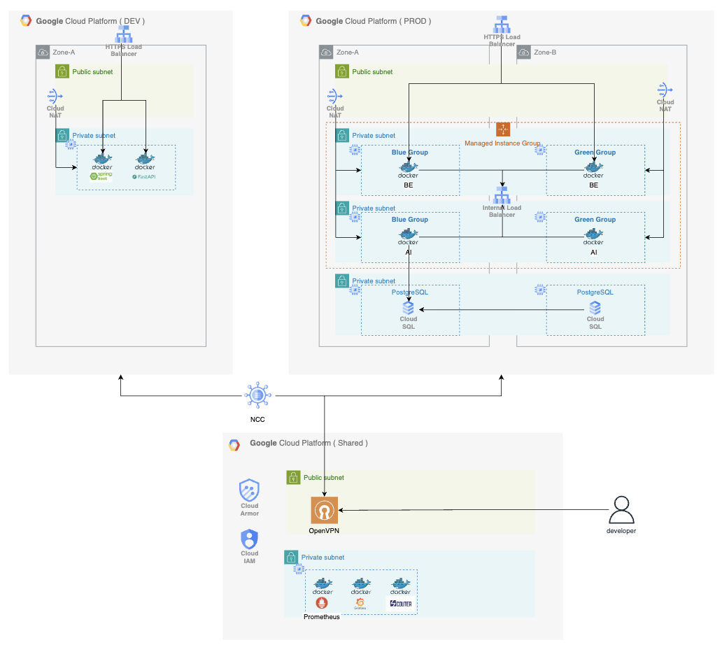 Shared VPC에 VPN이 위치하고 Prod VPC와 NCC(Network Connectivity Center)로 연결되어 VPN을 통해 내부망 접속이 가능하다.