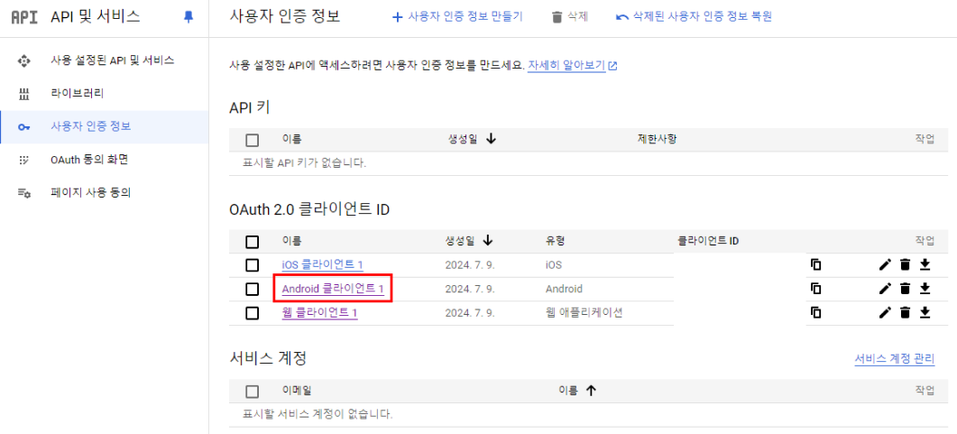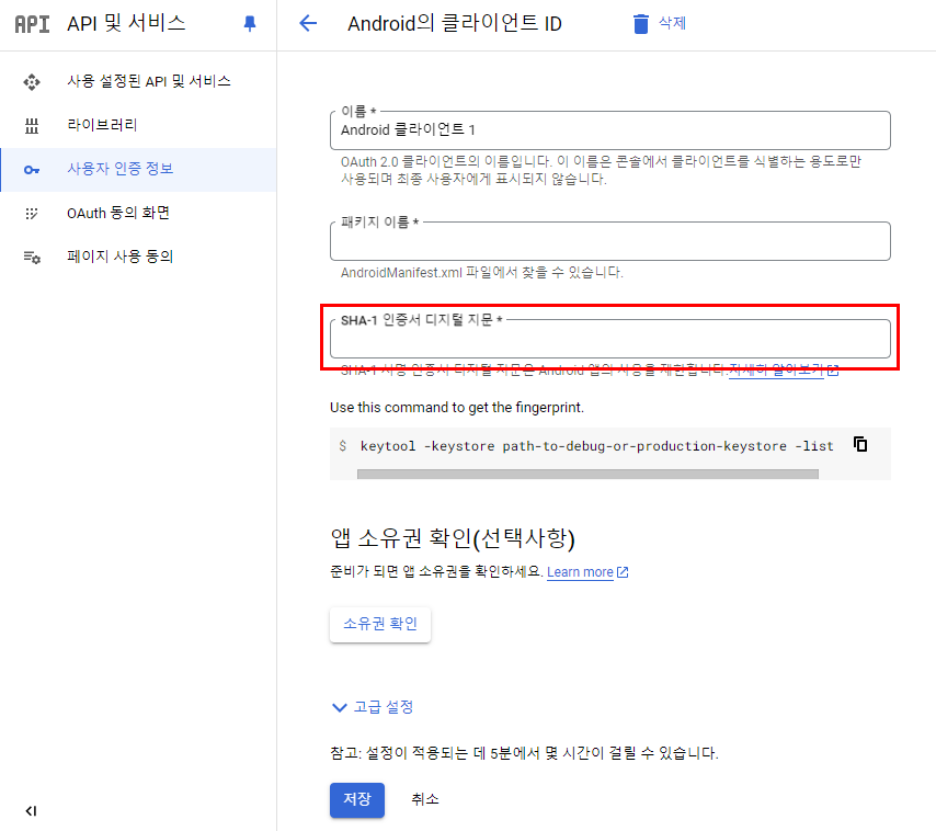 이제 명령어로 구한 SHA-1 값을 구글 콘솔에 입력해주면 된다.