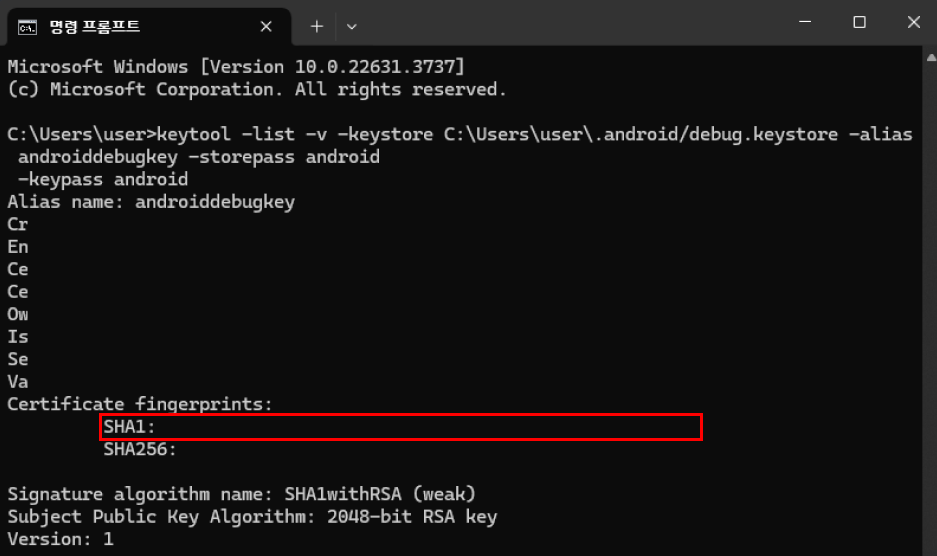 keytool -list -v -keystore [본인 컴퓨터의 경로]/.android/debug.keystore -alias androiddebugkey -storepass android -keypass android