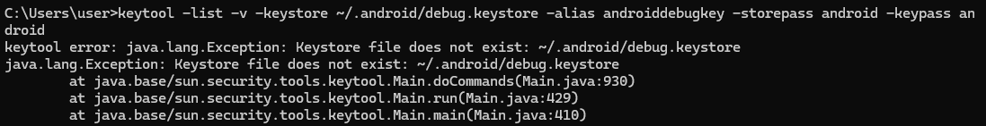 ~/.android/debug.keystore를 C:/Users/user/.android/debug.keystore으로 변경하니 잘 나왔다.