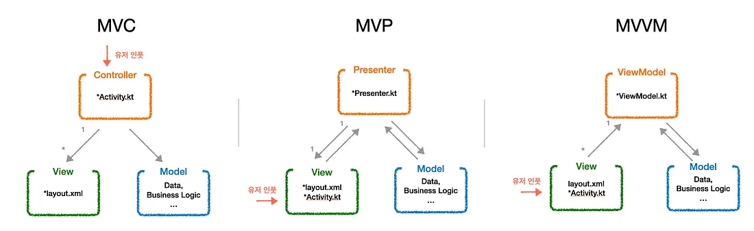 Model은 이전과 같고, View는 layout.xml과 Activity.kt를 일컫습니다.