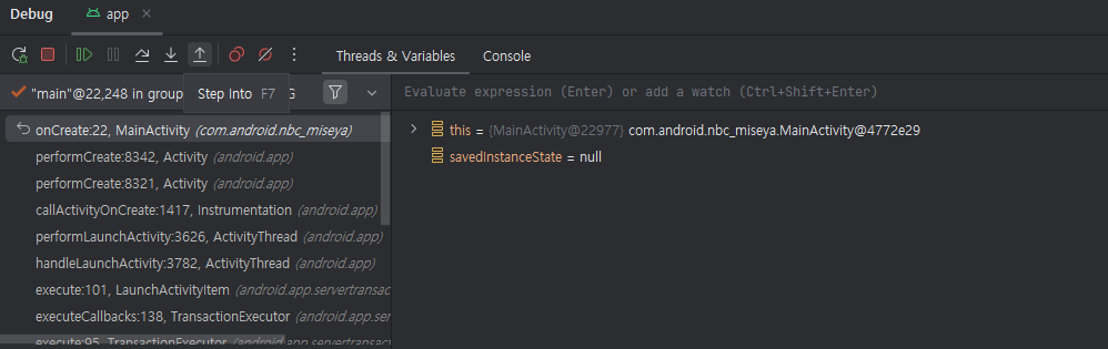 Step Into : 메소드 안으로 이동하는 버튼입니다. Step Over는 줄 단위로 이동하지만, Step Into는 메소드 단위로 움직입니다.