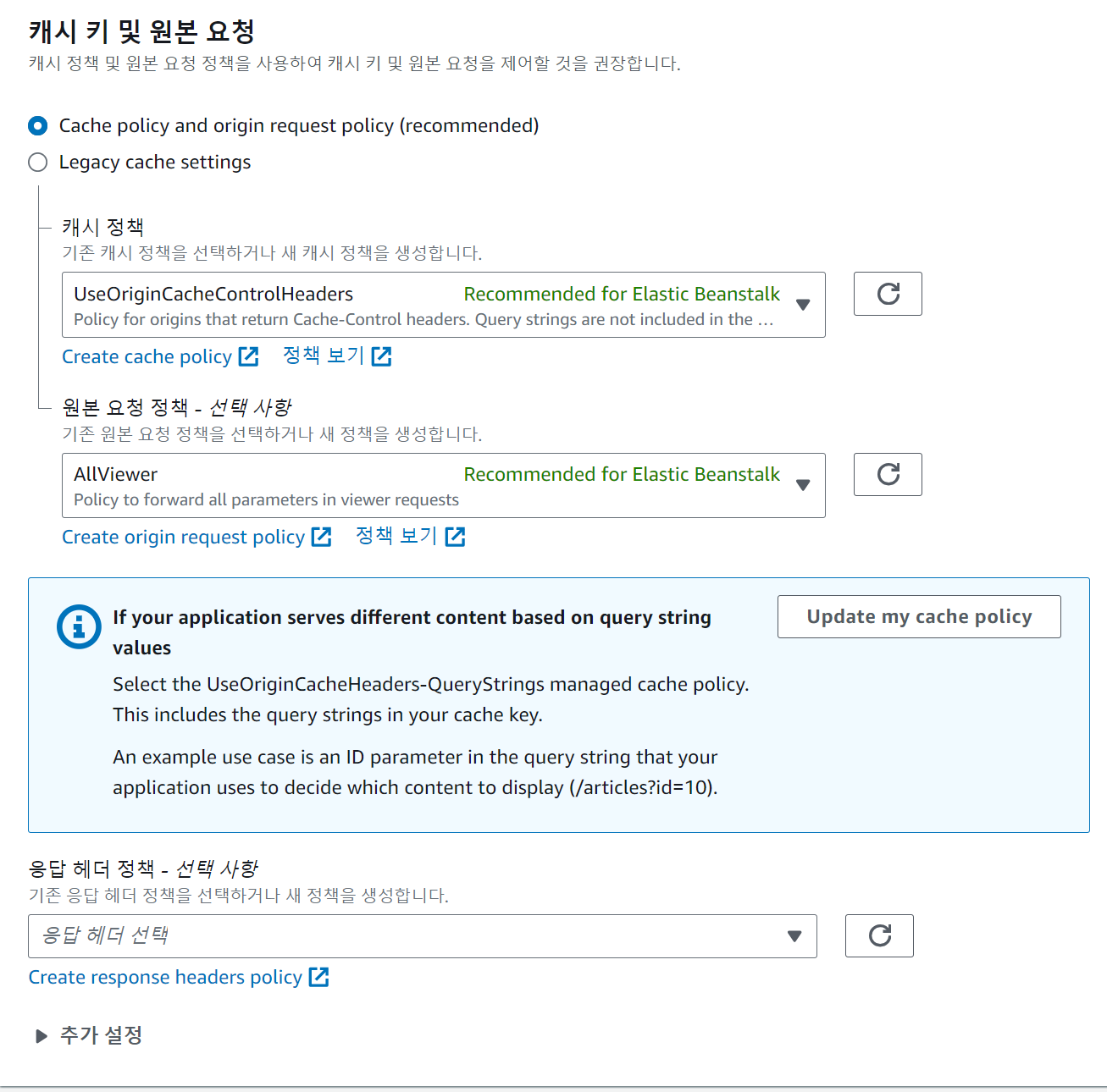 배포 > 배포 생성 에 들어간후 Origin domain에 EB 혹은 Alb 도메인 입력