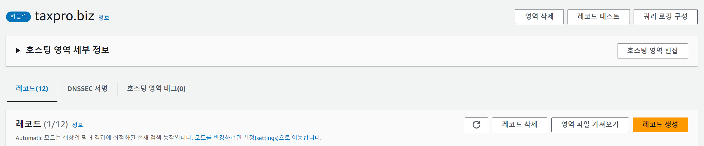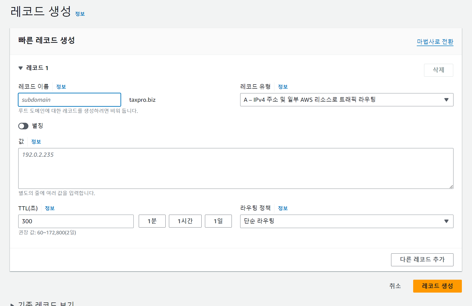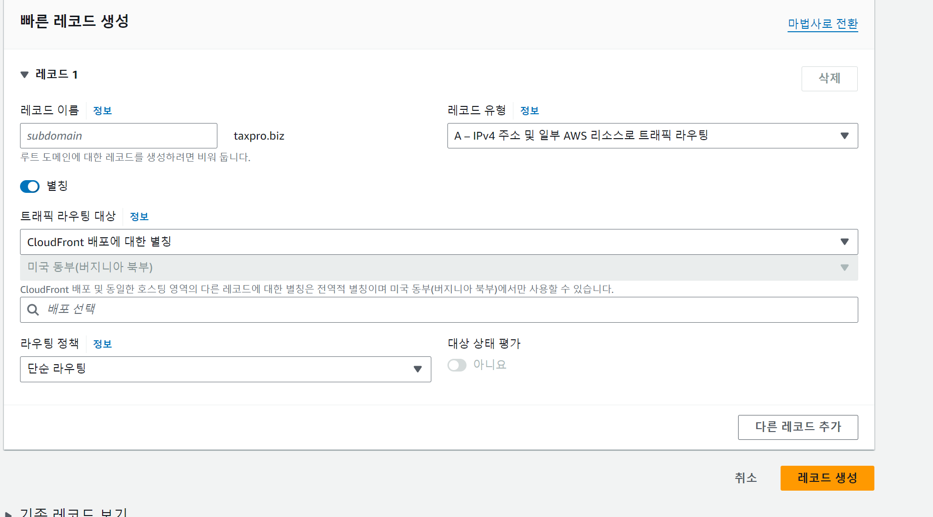 route 53 > 호스팅영역 > 호스팅선택 > 레코드 생성 클릭