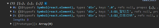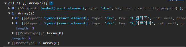 당연히 둘다 아래처럼 출력이 되는 줄 알았는데 children의 경우 depth가 두개로 표현되어서 출력이 된다. 의외로 예상되는 결과랑 다른것은 React.children이 아니라 children이라는 것이다. 따라서, children을 통해 조작을 하게되면 예상치 못한 결과를 만날 수 있다는 문제점이 있다는 것을 알게 된다.