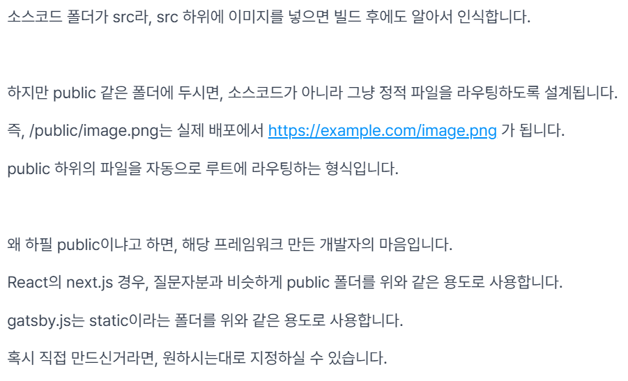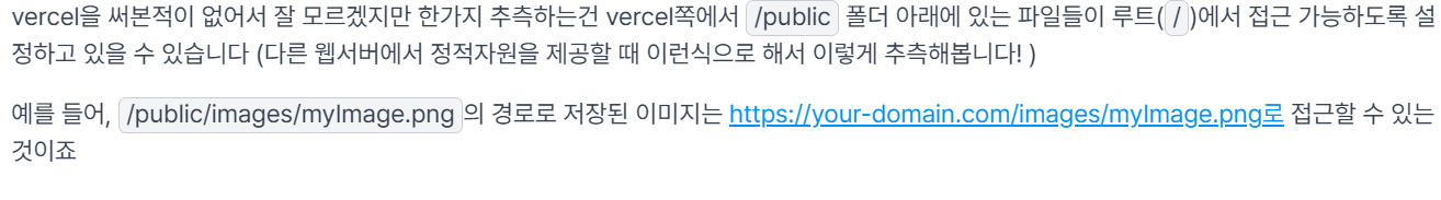 요약하자면 vercel의 기본 설정문제다. public이름을 가진 폴더에 이미지를 두면 public 하위의 파일을 자동으로 루트에 라우팅 한다고 한다. vercel 말고도 다른 호스팅 업체에서도 정적자원을 제공할때 이런 식으로 접근한다고 한다...