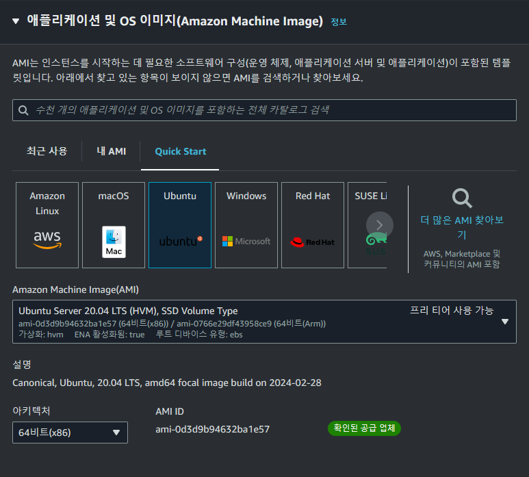 OS는 우분투 20.04 이미지를 사용합니다. 더 가벼운 이미지를 사용해도 되지만 사용의 편의를 위해 익숙한 이미지를 골랐습니다.