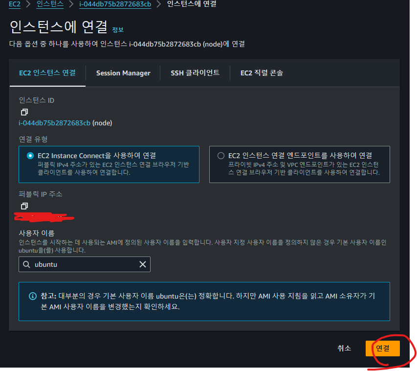 ec2 인스턴스의 퍼블릭 IP와 포트번호 3323( 혹은 22)를 이용합니다. 빨간 줄이 그어진 곳에 자신의 노드의 퍼블릭 IP를 입력합니다. 퍼블릭 IP는 ec2 콘솔에서 확인할 수 있습니다.