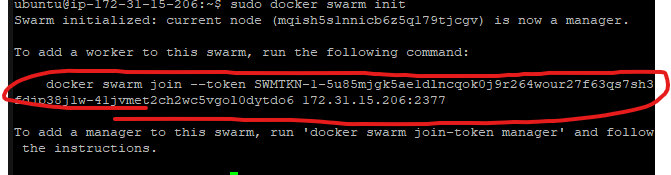 sudo docker swarm join --token SWMTKN-1-01x8w62u21o7320pyp6obdm5wtdcoajouyahad3m1pj191ph83-f3i041igqcgcikz1q90nhq4gi 172.31.15.138:2377