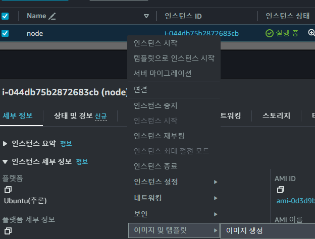 인스턴스를 우클릭해서 AMI을 생성합니다. 위의 설정이 완료된 인스턴스를 앞으로는 간단히 만들 수 있습니다.