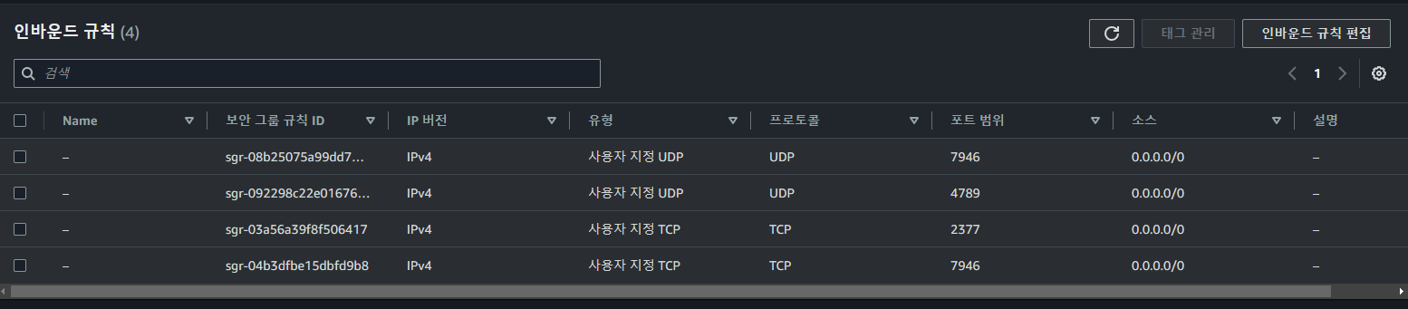 위와 비슷하게 인바운드 규칙을 추가해줍니다. 프로토콜 종류에 유의합니다.