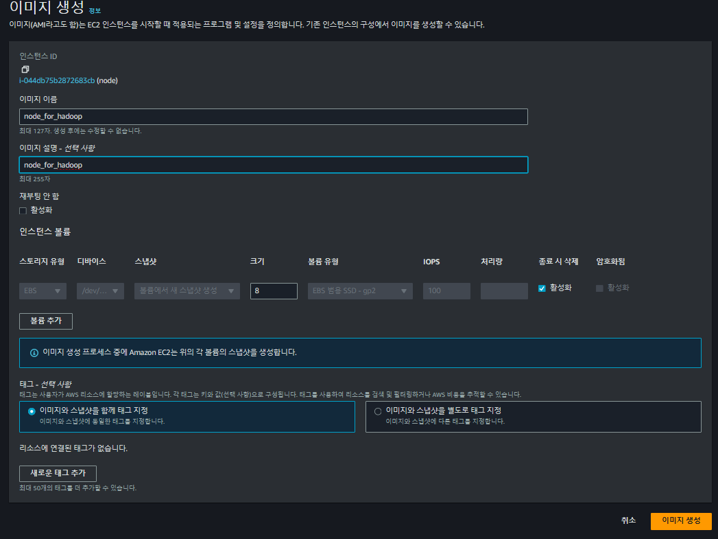 하둡과 컨테이너를 위한 이미지를 생성한 ec2 인스턴스의 AMI 이미지를 만들어 줍니다.