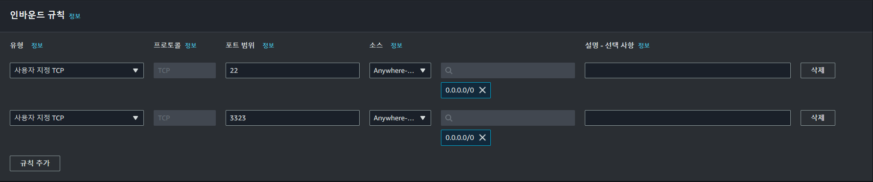 ssh위한 TCP 포트를 22, 3323번을 열었습니다. 이번 프로젝트에서 클라이언트에서 ec2 인스턴상으로의 ssh 연결은 3323번을 통해 이루어집니다. 이는 skt 공유기의 경우 22번 포트 연결을 허용하지 않는 경우가 있기 떄문입니다. 해당하지 않는다면 그대로 22번을 사용하셔도 좋습니다.