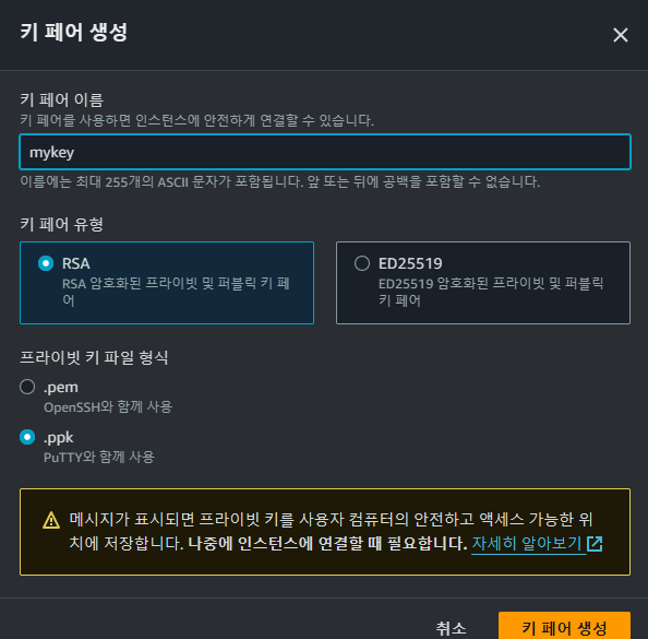 이는 원격 호스트에서 ec2 인스턴스로 원격 접속하는데 사용됩니다. 현재 사용중인 환경에 따라 mac/linux → .pem 확장자 windoe → .ppk 확장자를 선택해 키페어를 생성해줍니다.