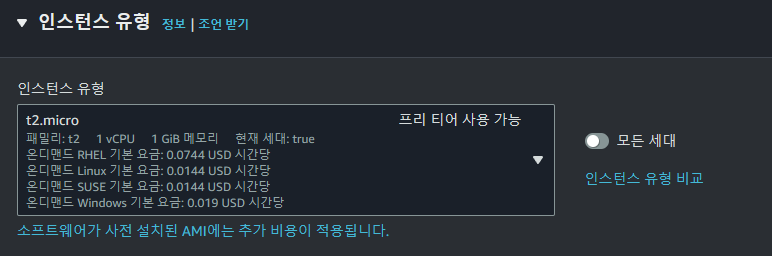 가장 비용이 저렴한 t2.micro 유형을 선택합니다.