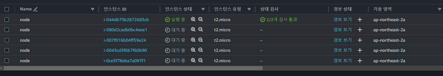 위의 이미지를 이용해 node 인스턴스를 4개 더 생성합니다. 보안 그룹또한 처음 만든 노드와 같이 설정합니다. 이미지 생성 요청 후 생성완료까지는 약간의 시간이 걸립니다. 완료 전에 인스턴스 생성 시 에러가 발생합니다.