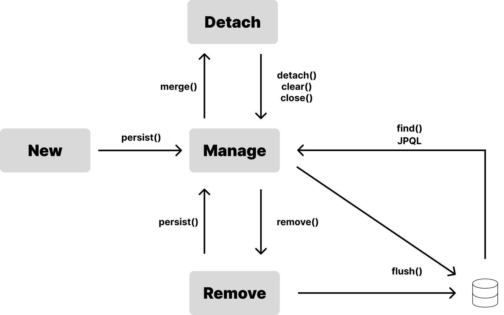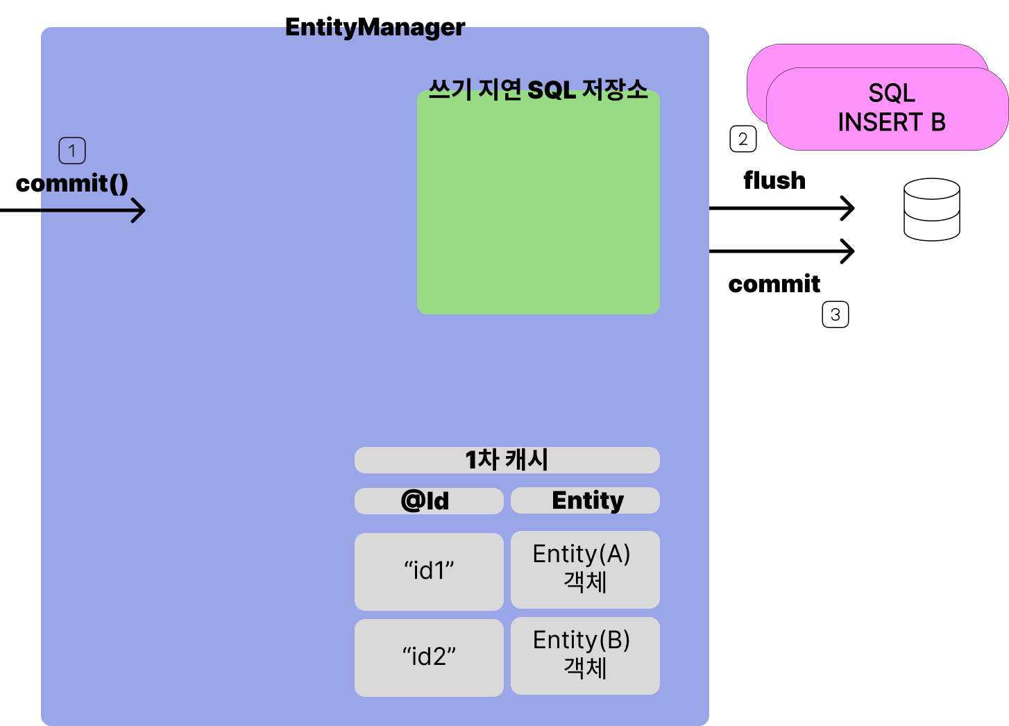 - 엔티티 매니저는 Trasaction을 commit하기 직전까지 DB에 entity를 저장 ❌, 내부 쿼리 저장소에 SQL을 모아둠