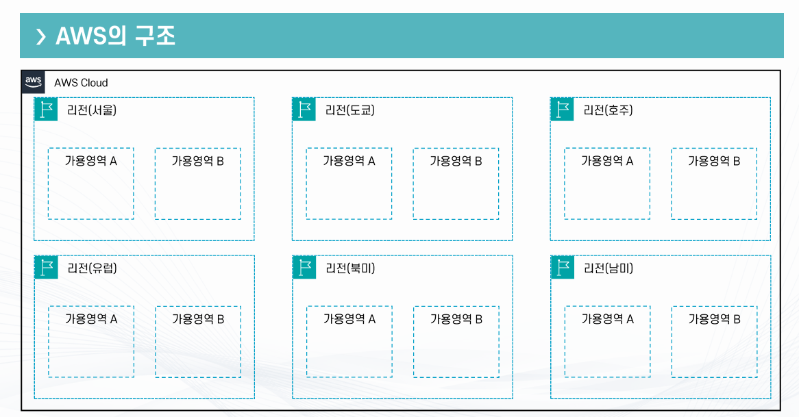 AWS 계정 아래에는 여러 리전이 있고, 각 리전은 여러 가용 영역으로 구성된다.