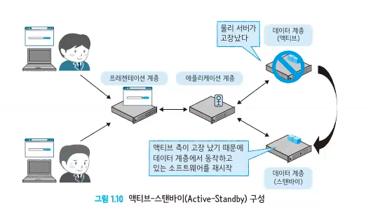 액티브 데이터 계층과 스탠바이 데이터 계층이 같은 데이터를 공유하고, 만약 액티브가 죽으면 스탠바이에서 액티브의 역할을 대신하면서(장애조치) 소프트웨어를 재시작한다(장애복구).