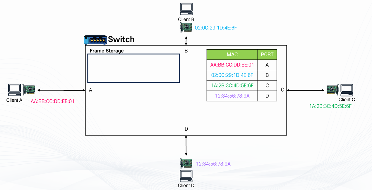 🧠 Switch 안에는 테이블이 있고 각각의 포트별로 MAC Address를 가지고 있고, 프레임을 저장할 수 있는 공간이 있다.