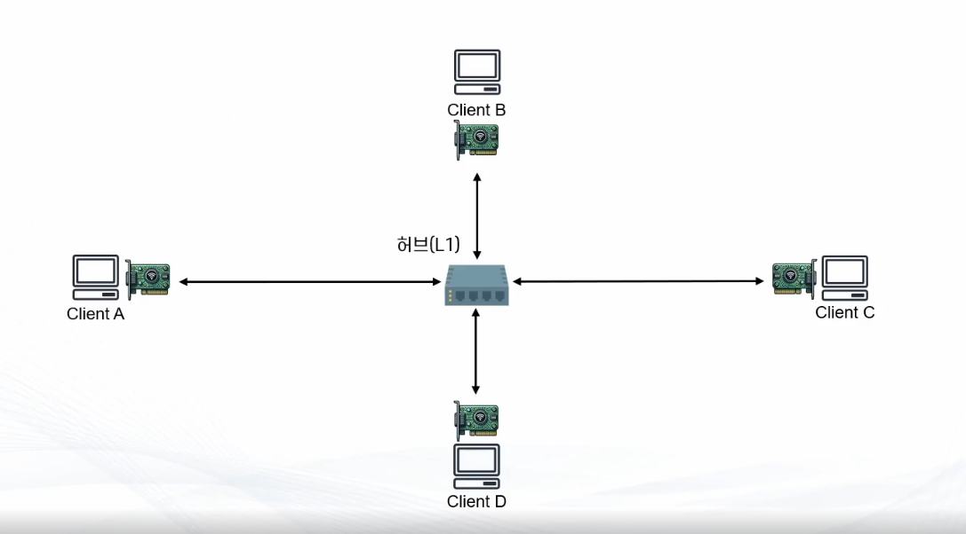 그래서 그 역할을 하는 것이 물리계층에서는 Hub다.