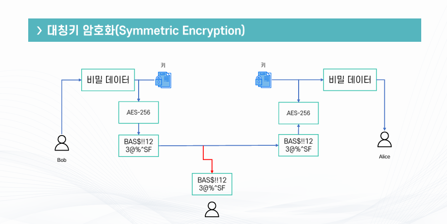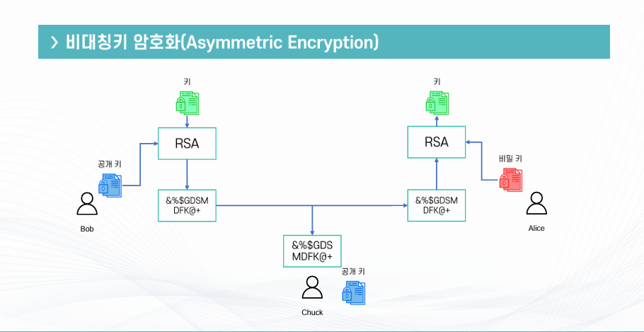 Bob과 Alice가 정보를 주고받을 때, Chuck이 중간에 데이터를 빼내면 키만 가지고 있으면 데이터를 복호화 할 수 있는 문제가 있다.